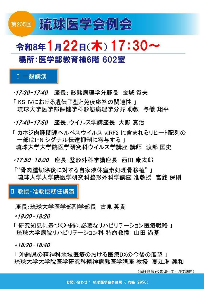 【お知らせ】第205回 琉球医学会例会開催(事前申込不要) 投稿日:2025 年 12 月 25 日 木曜日 〜会場についてのご案内〜 琉球大学医学部西普天間キャンパス教育棟6階 602室 記事 « 前の記事へ