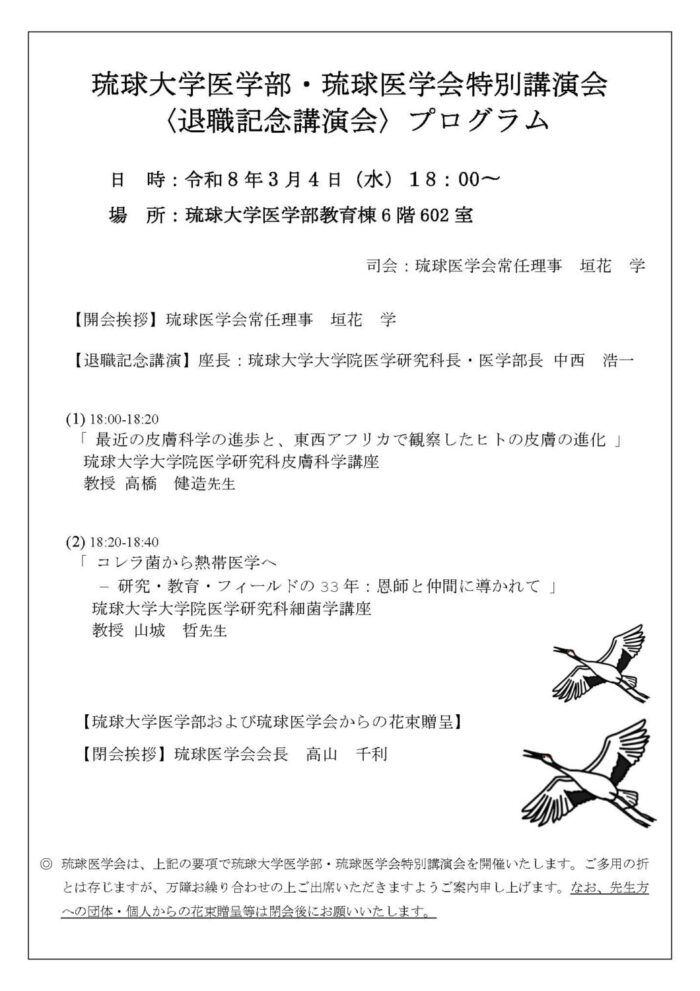 【お知らせ】令和7年度 退職記念講演会開催(事前申込不要) 投稿日:2026 年 1 月 26 日 月曜日 万障お繰り合わせのうえご出席くださいますようご案内申しあげます 〜会場についてのご案内〜 琉球大学医学部西普天間キャンパス教育棟6階 602室 記事 « 前の記事へ
